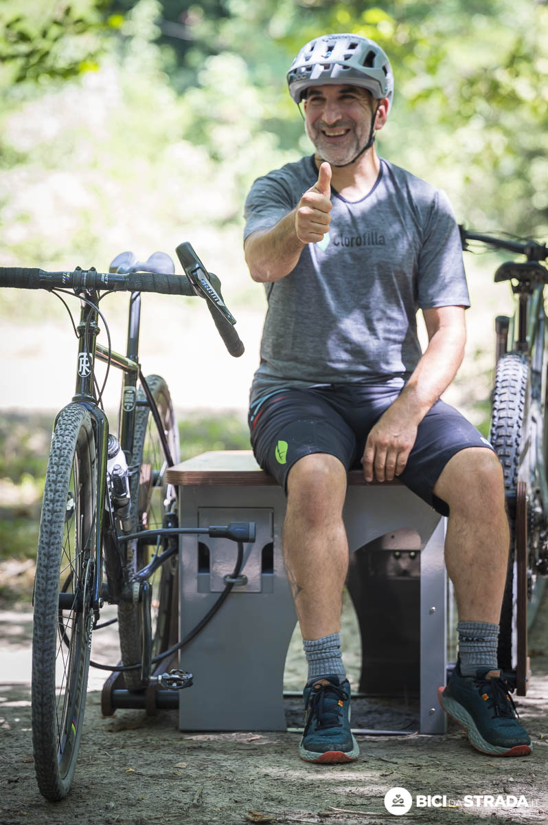 Ogni seduta permette l'alloggiamento e l'eventuale ricarica di due bici e la seduta di due ciclisti.