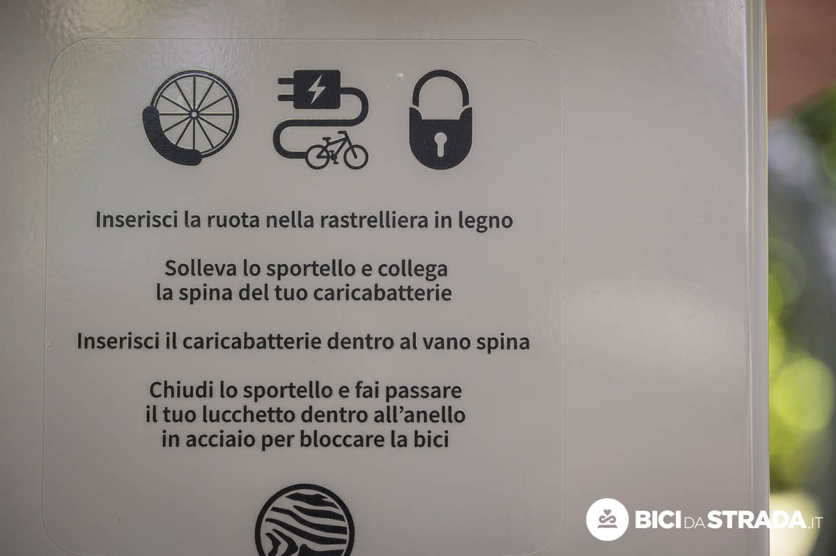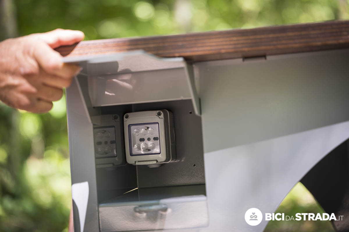 Fa il paio con la colonnina ed è pensata per la sosta del ciclista o di un e-biker e incorpora due prese di corrente Shuko, due vani (chiudibili con il lucchetto di sicurezza del ciclista e vincolabile alla bici) dove riporre il caricabatterie (non fornito).