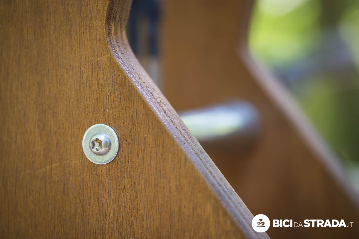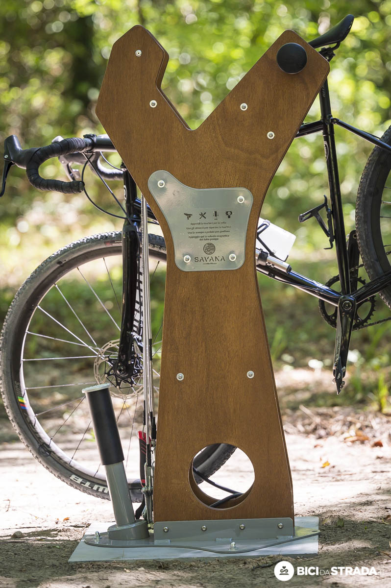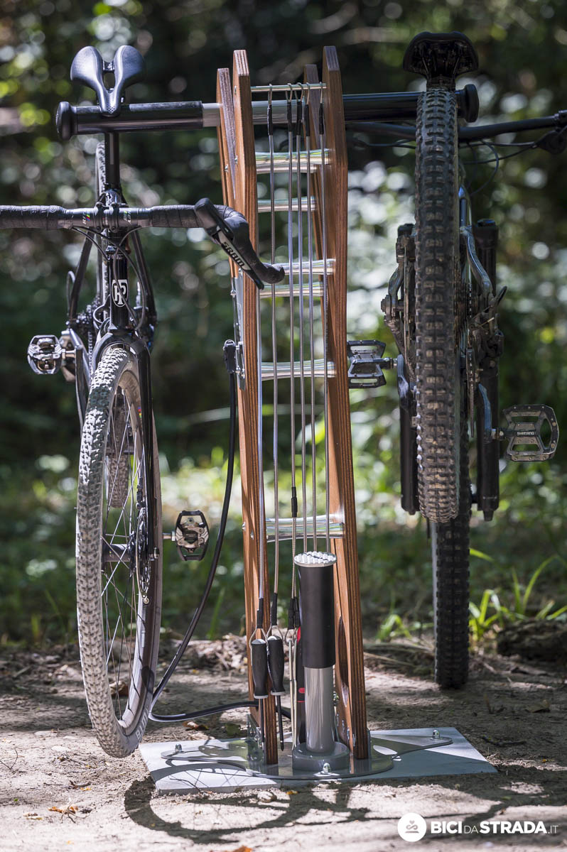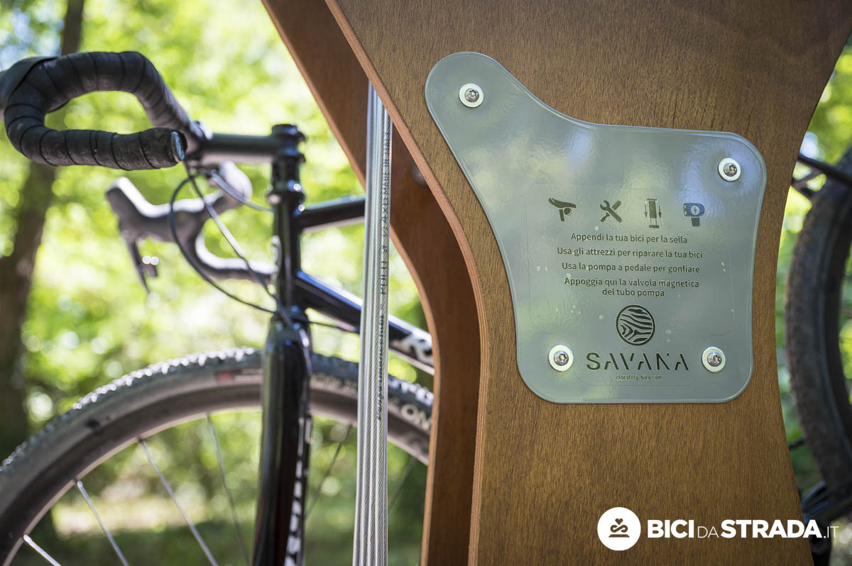 Si tratta della prima colonnina realizzata in legno e acciaio e dotata degli attrezzi necessari per la manutenzione basilare, ovvero pompa a pedale, cacciaviti con punta a taglio e a croce, due levagomme, chiave di serraggio pedali da 15 mm, chiave inglese universale da 0 a 20 mm, multitool con chiavi a brugola da 2,5-3-4-5-6-8 mm e Torx da 25.