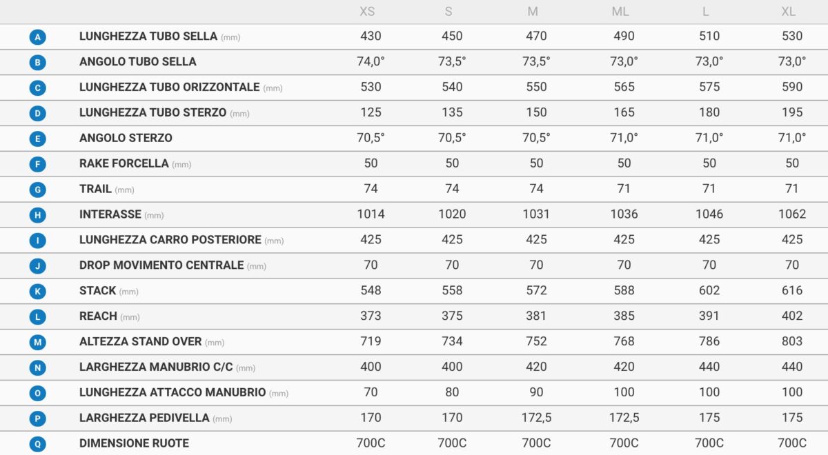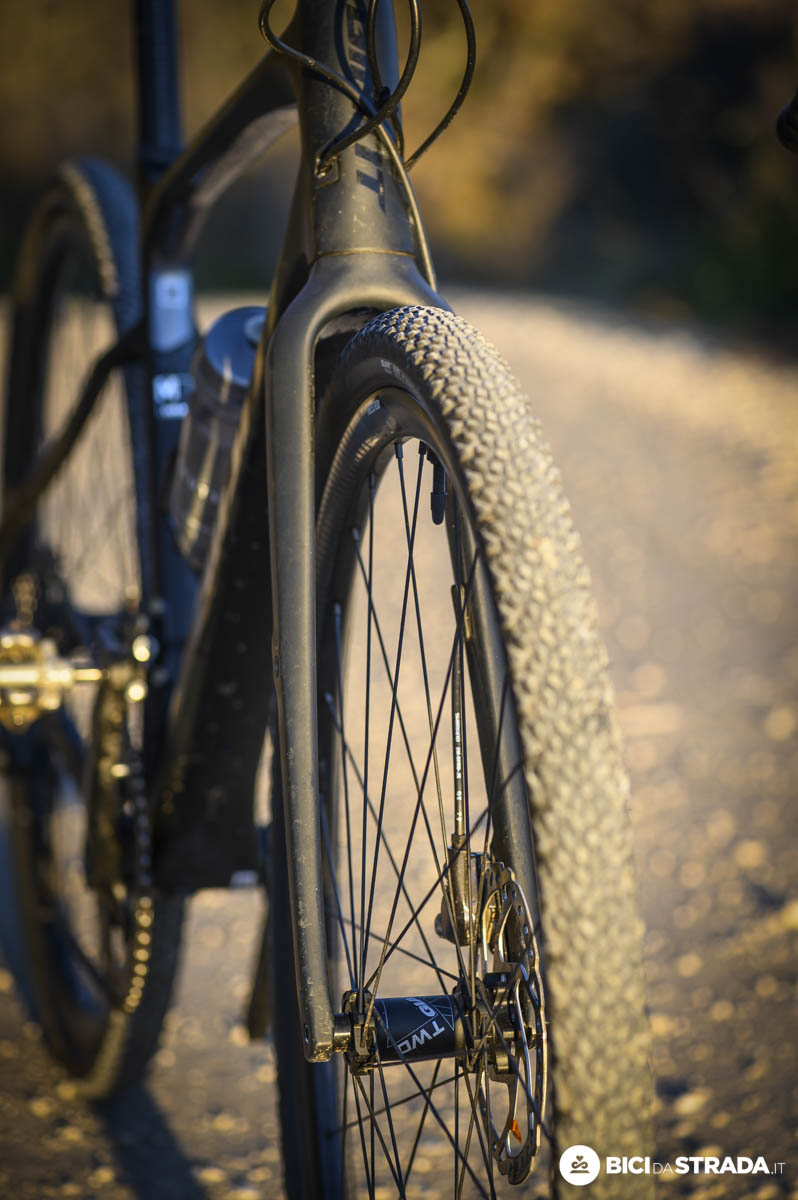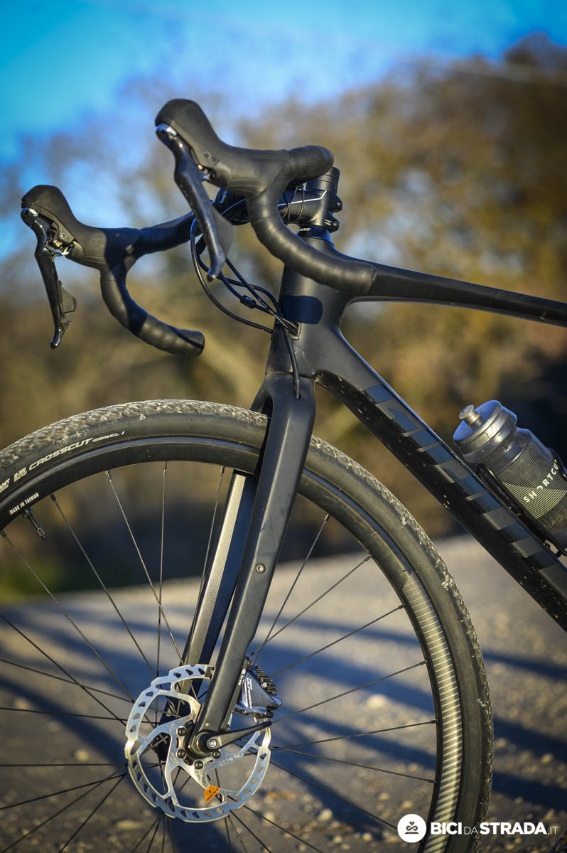 Parlando di angoli, quello del piantone misura 73,5 gradi, mentre quello dello sterzo è di 70,5 gradi. Dei valori che si pongono quindi a metà tra una bici da strada e una Mtb e che dovrebbero garantire buone prestazioni sia sull'asfalto, sia sullo sterrato.