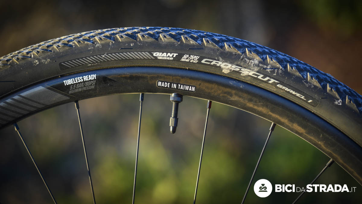 Le ruote sono in carbonio, sempre marchiate Giant (modello CXR-1) con cerchi tubeless da 21 mm (interni) che vengono abbinati a delle gomme Giant CrossCut Gravel da 40 mm. Il giusto compromesso tra grip, comfort e reattività.
