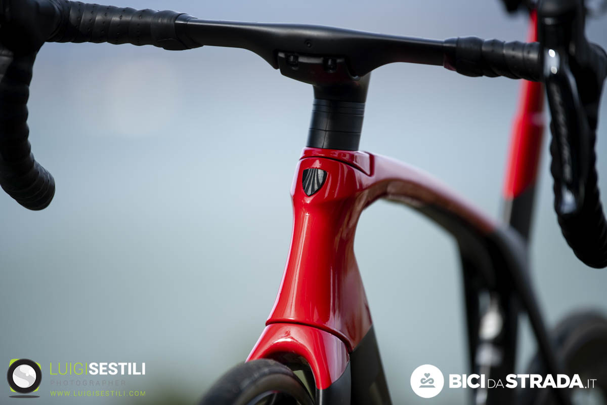 Il cockpit semi-integrato, con passaggio cavi completamente interno, è progettato per ottimizzare l’aerodinamica, ma ha anche un notevole impatto sull’estetica della bici, che risulta più aggressiva e filante.
