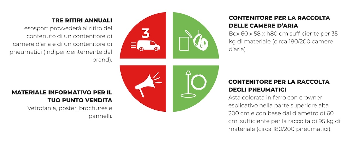 Un'iniziativa che muove dalla collaborazione con esosport, realtà nata nel 2009 e specializzata nel recupero e riciclo di materiali di scarto nel mondo dello sport. Grazie a questa sinergia il negoziante può godere gratuitamente del servizio di ritiro e smaltimento a norma di legge di copertoni e camere d'aria fuori uso.