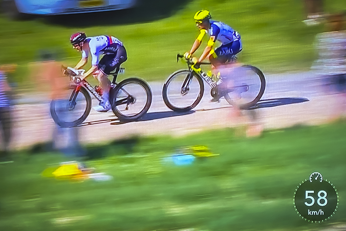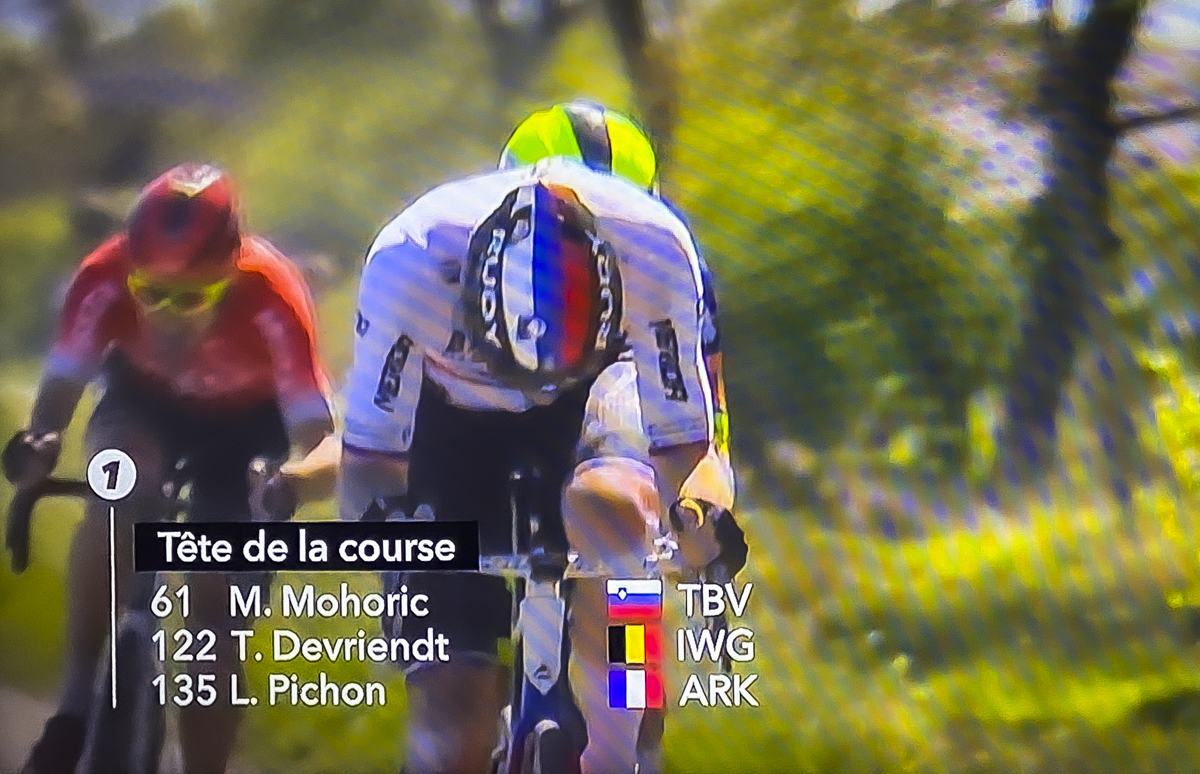 Da questa immagine catturata dalla TV si nota molto bene la differenza tra Mohoric e Devriendt, che anche se a ruota pare prendere più vento dello sloveno