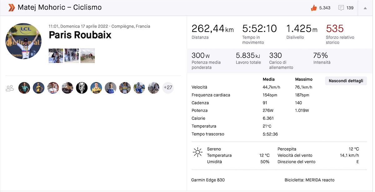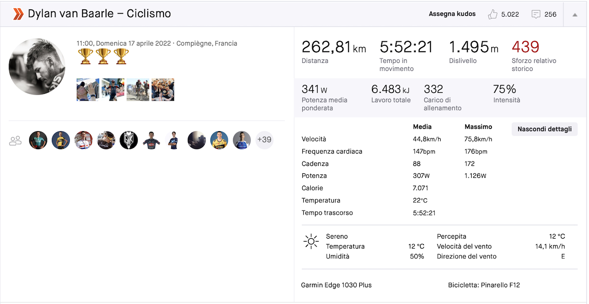 Beh, da uno che si è fatto gli ultimi 110 km in fuga (mai da solo, ma è sicuramente quello che ha tirato di più), ti aspetteresti una potenza media e normalizzata più alta rispetto a tutti quelli che sono arrivati insieme a lui o a pochi secondi di distacco. Unica eccezione, forse, Van Baarle, che si è fatto gli ultimi chilometri in solitaria ad un wattaggio pazzesco.