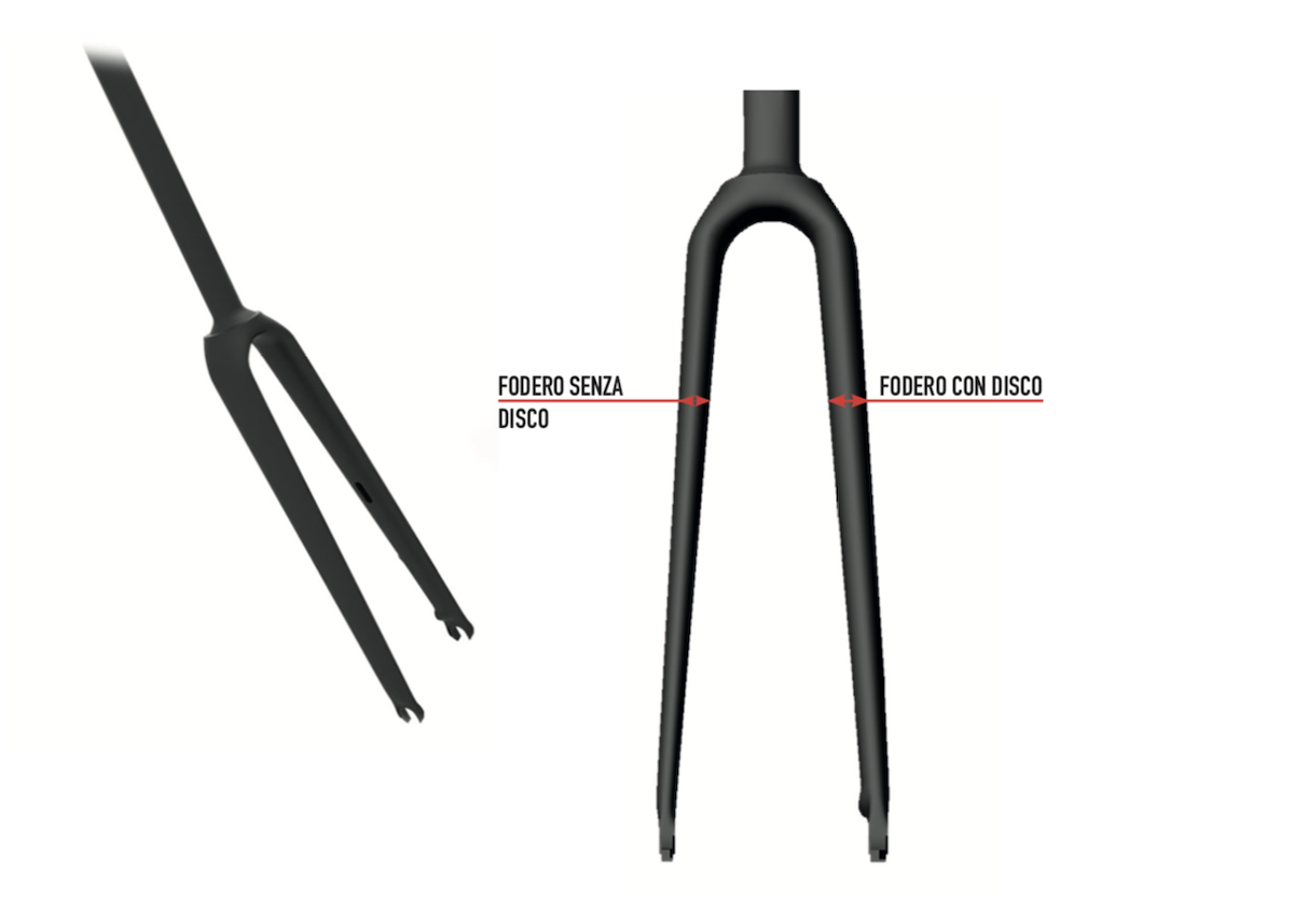 Il fodero sinistro, cioè quello dove è montata la pinza freno, ha una sezione maggiorata rispetto al fodero destro, in modo da compensare le forze generate dalla frenata a disco, evitando flessioni e migliorando controllo e precisione di guida.